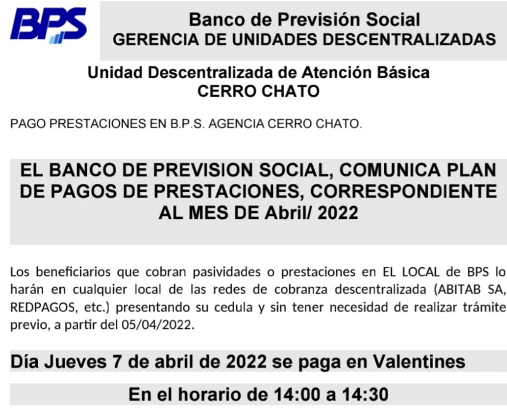 El Banco de Previsión Social comunicó el pago de pasividades y jubilaciones el próximo dia Jueves siete de abril del 2022 en Valentines de 14:00 a 14:30.